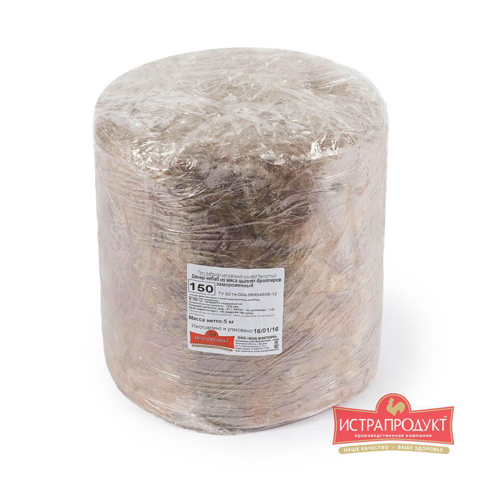 Компания «Истрапродукт» предлагает желающим приобрести куриный полуфабрикат для шаурмы по выгодным ценам. Он расфасован в упаковки по 2 килограмма, размер минимальной партии составляет 300 кг. Наши Донеры поставляются в пакетах.